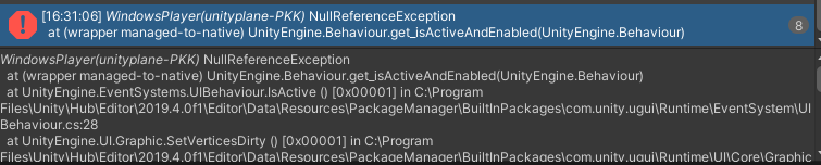 Behaviour.get_isActiveAndEnabled(UnityEngine.Behaviour)로부터 발생한 걸 보아 씬이 새로 로드 됐는데도 해당 개체가 참조되고 있어서 그런듯하다.