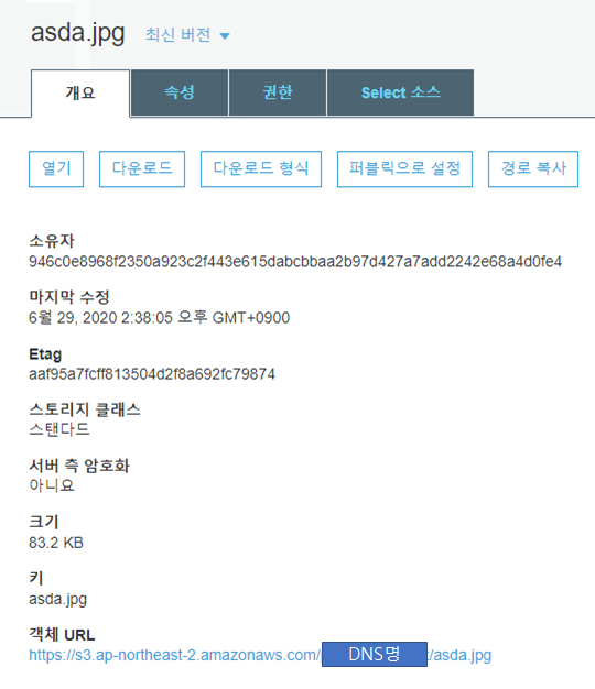 임시로 파일을 하나 업로드해서 객체 URL을 알아낸 뒤, DNS명까지만 복사해서 붙여넣자.