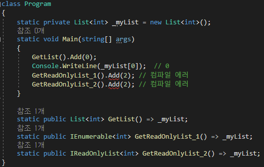 IEnumerable은 단순히 컬렉션을 순회하는 데에만 쓰이므로 컬렉션의 데이터 변경을 막는 데 사용할 수 있다. List, Array 등 데이터 변경이 가능한 컬렉션 대신 IEnumerable을 참조하도록 하는 것이다