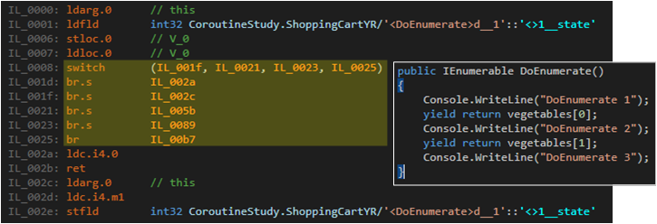 yield return은 foreach와 다르게 switch 분기문으로 로직이 구성됐다.