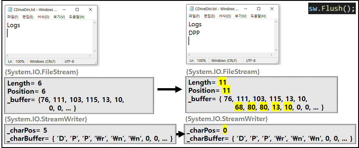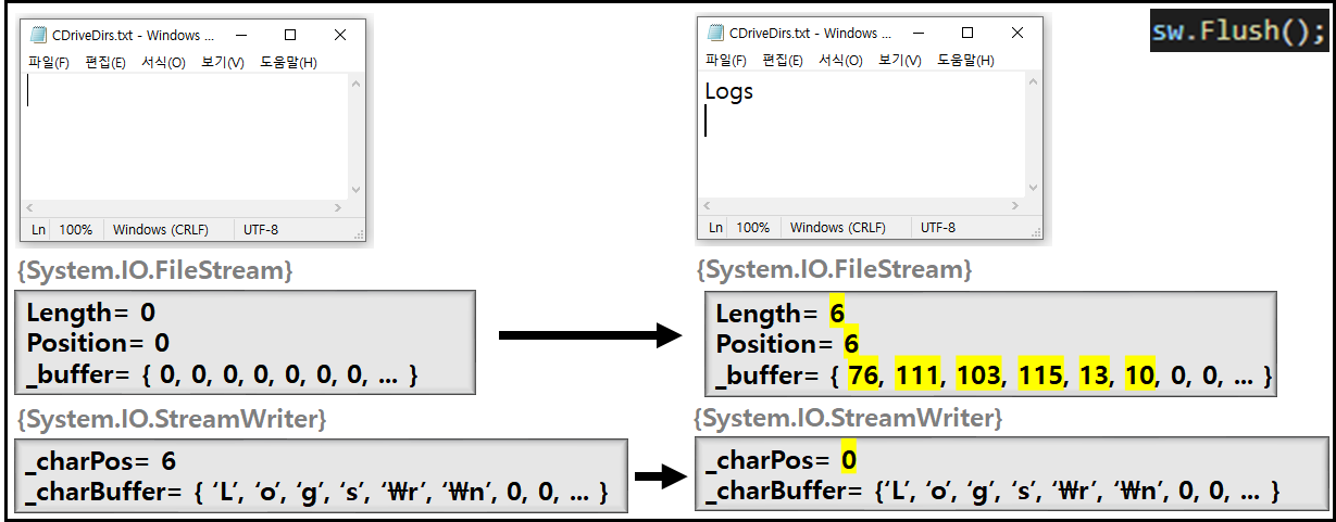 WriteLine()과 Flush()가 어떤 동작을 하는지 살펴보자.