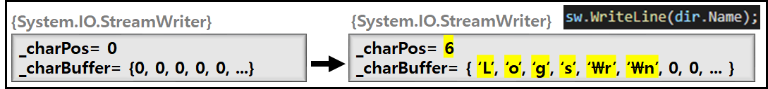 WriteLine()은 StreamWriter._charBuffer에 문자열을 저장하는 함수고,