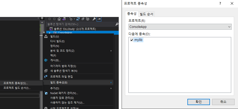 빌드 종속성에 DLL 프로젝트를 체크한다.
