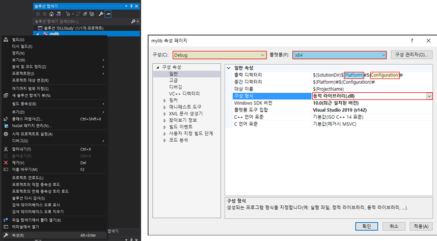 구성 형식(Configuration Type)을 동적 라이브러리(.dll)로 바꾼다.
